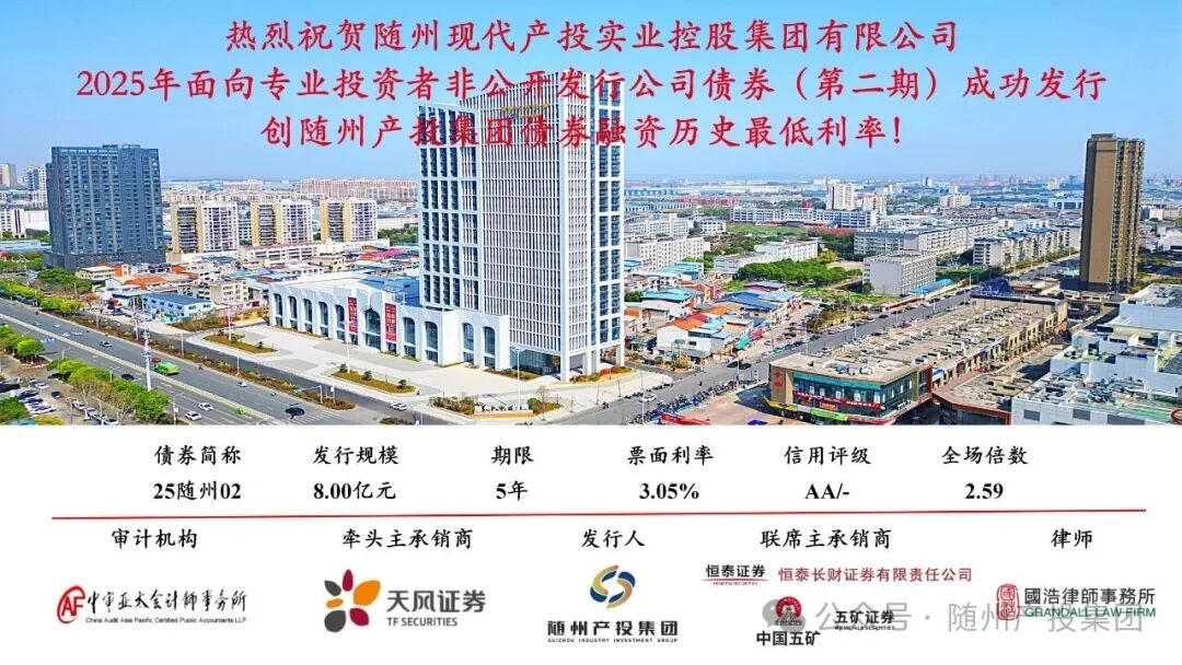 11月10日,随州现代产投实业控股集团有限公司2025年面向专业投资者非公开发行公司债券(第二期)成功发行,本期债券发行创随州产投集团债券融资历史最低利率3.05%,全场认购数高达2.59倍,充分展现了市场投资人对随州产投集团综合实力和发展前景的高度认可。